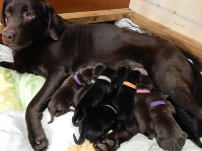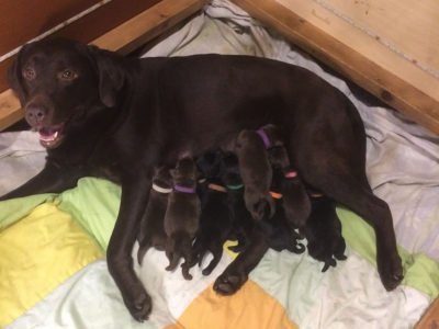 Ranger wurde am 28.12. im Kennel Fire of Black Mountain 9facher Vater. Paula brachte in einem unkomplizierten ersten Wurf 9 prächtige Fellnasen zur Welt. Es sind 2 chocolate und 2 schwarze Rüden – 2 chocolate und 3 schwarze Hündinnen. Mama und Babys sind wohlauf. Wir sind mega stolz auf unseren Ranger. Danke Gertrud, dass du uns wieder dein Vertrauen geschenkt hast.
